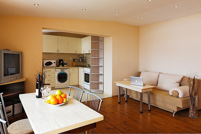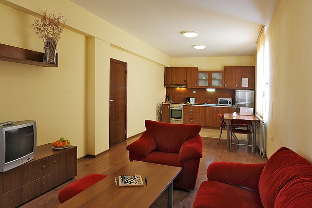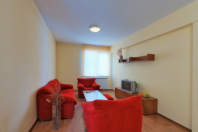• Jednosobni apartmani  (max 2+2; 45m2): sadrže spavaću sobu sa dva klasična ležaja ili sa francuskim ležajem i dnevni boravak sa sofom na razvlačenje.